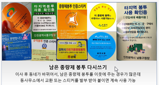 이사날에 맞춰서 사놓았던 쓰레기 종량제봉투를 다 사용하기 어렵잖아요? 남은건 두고오거나 주변사람들 주고와도되지만, 이사 간 동네 주민센터에서 스티커를 받아 붙여쓰면 계속 사용이 가능하다고 합니다.