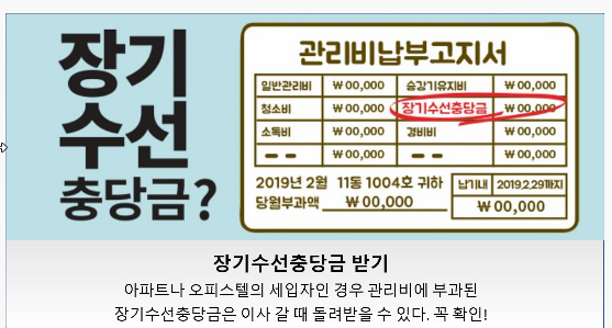 다소 생소한 용어일지도 모르지만 아파트 세입자의 경우 엘리베이터보수, 노후배관, 도색공사 등 을 위해 미리 입주인들에게 돈을 모아서 수리를 한다고 합니다. 이사갈때 돌려받을 수 있으니 관리비고지서 체크해서 받아가시면 됩니다.