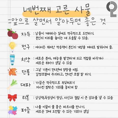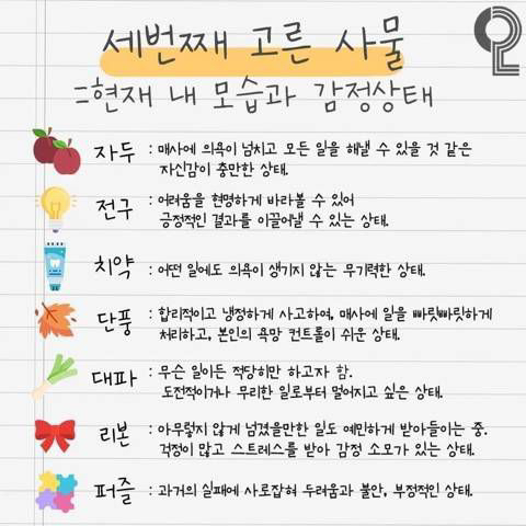 7가지 사물중 4가지를 골라 차례대로 해석을 보면 됩니다. 맞는지 아닌지 10초면 확인가능하니 한번 해보세요!
