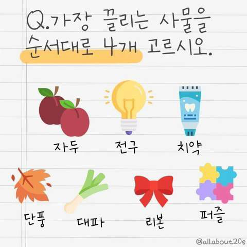 1. 끌리는 사물 4개 고르기 (순서 기억하세요.)