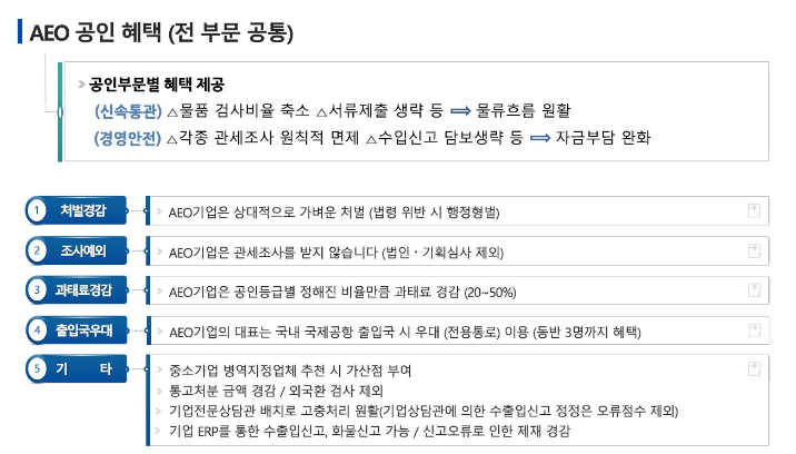 AEO 공인 주요 혜택 분야로는 1)수출입통관, 2)심사및 납세, 3)처벌 및 행정제재 경감, 4)보세광장 및 특허, 5)대표자(주요임원) 우대로 확인된다. 수출입통관 분야 혜택으로는 검사비율축소, 우선검사, 관리대상해제, 수입물품(일부)세관장확인 생략, 검사대상 화물 반입허용, 수출신고 서류제출 대상 및 수입신고 서류제출대상 선별제외, 원산지증명서 자동발급, 전자통관심사로 확인된다. 심사 및 납세 분야 혜택은 기획심사 제외, 법인심사 제외, 외국환검사 제외, 수정수입세금계산서 발급허요, 사전세액심사 제외, 검별보정심사 및 건별환급심사 제외, 월별납부 허용, 사후납부 및 월별납부 담보제공 이다. 처벌 및 행정제재 경감 분야 혜택으로는 법규위반시 행정질서벌등 우선고려, 과태료 경감, 통고처분금액 경감, 보세공장 특허취소, 반입정지 처분 경감, 특허보세구역 반입정지 기간 하향조정 등이 있다. 보세공장 및 특허 분야 혜택은 자율보세공장지정 및 특례, 보세운송 특례, 특허갱신기간 연장, 정기점검 완화, 보세운송 일괄신고로 확인된다. 마지막으로 대표자(주요임원) 우대상항은 여행자 검사대상 선별제외, 입출국 심사시 전용검사대 이용, 국제공항 보안검색시 승무원전용통로 이용, 국제공항 CIP 라운지 이용으로 확인된다.